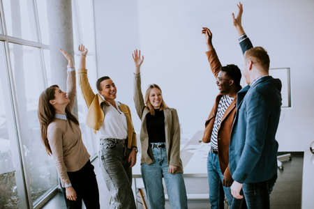 Success and teamwork concept, Successful team of young perspective business people in office, business group celebrating after meeting