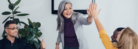 panoramic shot of smiling multicultural colleagues giving high five and showing like