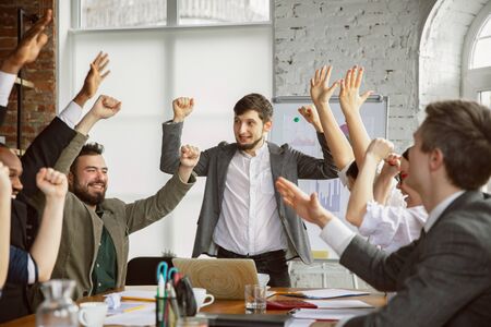 Cheerful group of creative business people winning great successful stretegy achievement in meeting room office background