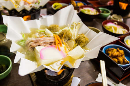 Japanese food. Sukiyaki. Meat and vegetables boiled in broth.