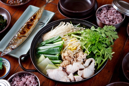 Korean cuisine Daegu Tang, fish roe and codfish soup with vegetables