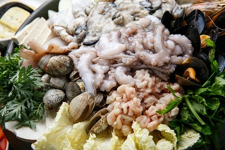 Homemade hotpot with different seafood at home