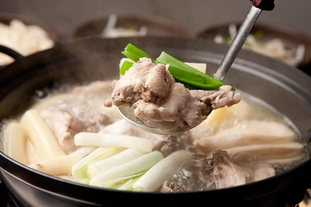 Ladle scooping up broth from dak-gomtang, korean soup dish with cut chicken meat boiled as its broth