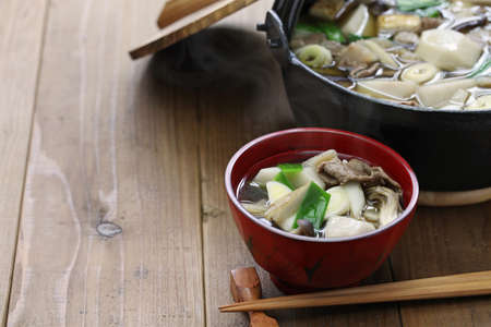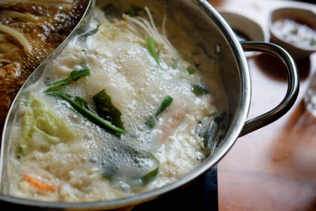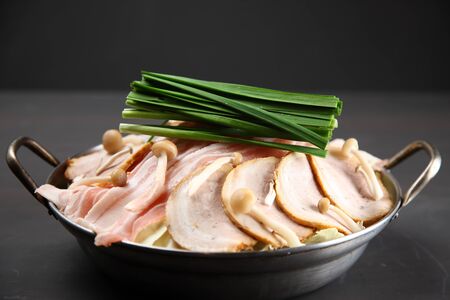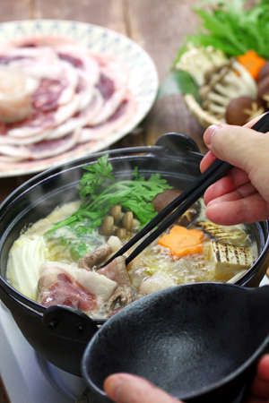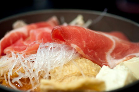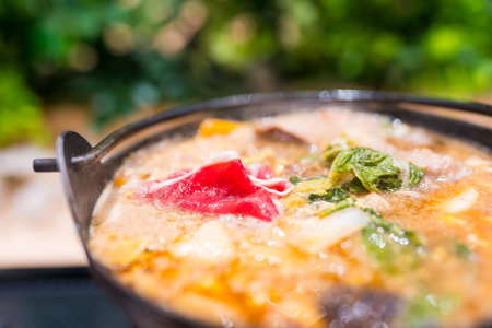 Close up of traditional vintage Japanese suki pot. Fresh pork dip into hot Japanese suki soup with vegetables