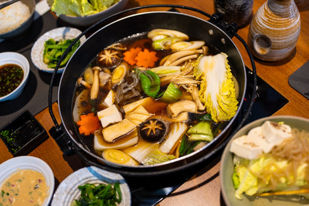 Boil man vegetables in hot soup Ingredients cooking sukiyaki pot. Sukiyaki hot pot simmering with vibrant vegetables ready to enjoy