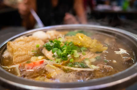 Close up view of meat and vegetables boiled in water delicious food most popular in Thailand.