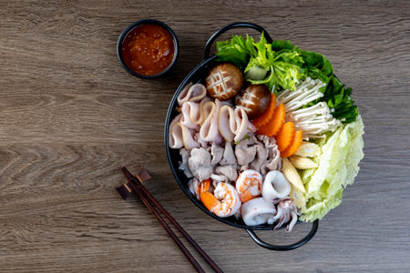 Seafood set of Sukiyaki, Shabu with noodle and vegetable in the pot on wooden table
