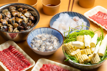 Japanese food shabu shabu set up on the wooden table