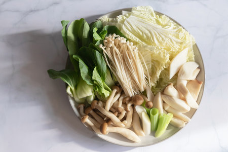 Organic vegetables, arranged in bowl. Set of healthy vegetables such as carrots, mushrooms, green vegetables for use in shabu and sukiyaki