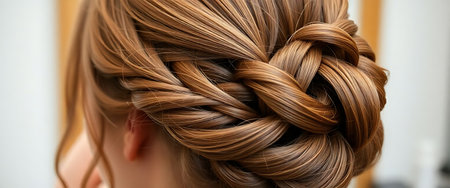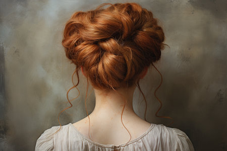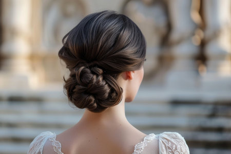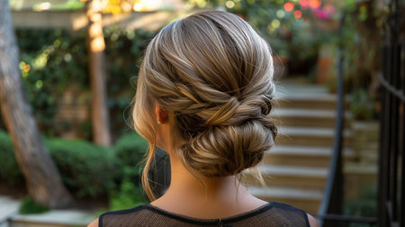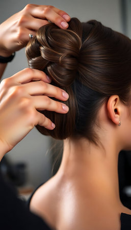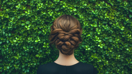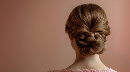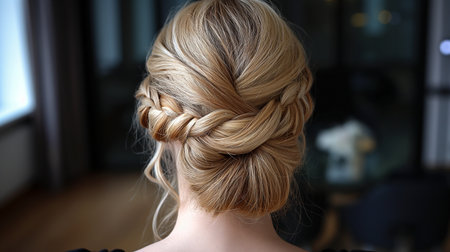A woman with long hair is pictured with a neatly braided hairstyle, An elegant chignon style from the perspective of a behind-the-scenes hairstylist, AI Generated