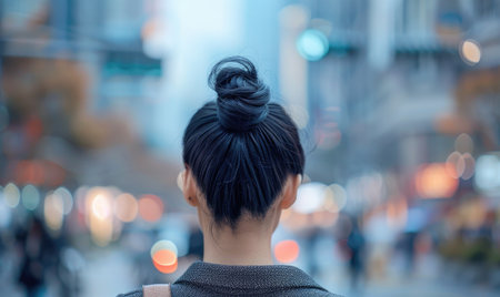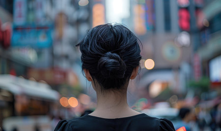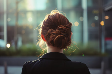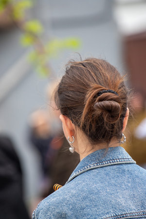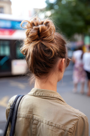 Elegant chignon hairstyle of a woman against the backdrop of the city