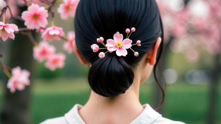 Sakura flower-shaped hairpin adorns a hair bun of Japanese girl in kimono back view. Elegant modest traditional womens hairstyle. Blooming pink cherries. A feminine stylish hair accessory. Springtime.