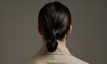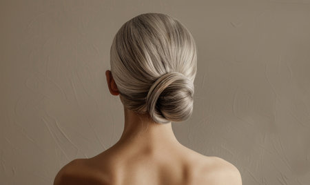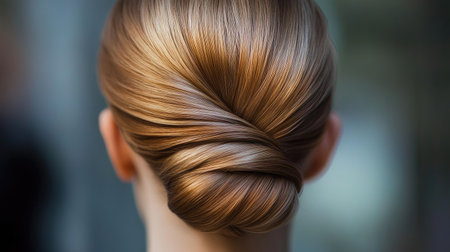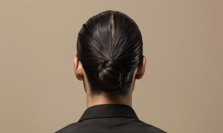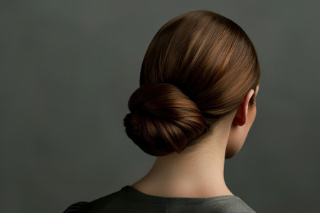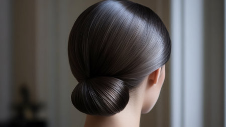 A close-up of a sleek chignon, with hair smoothly twisted into a low bun, perfect for a polished, professional style.