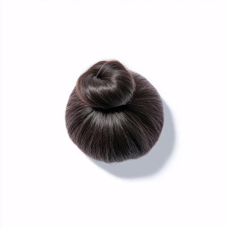 This stock photo showcases a sleek dark brown hair bun from a top perspective, highlighting its glossy texture and elegant form, ideal for beauty and hairstyling projects.