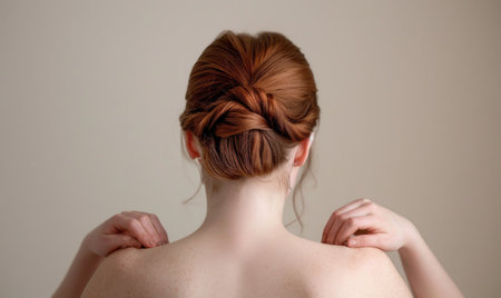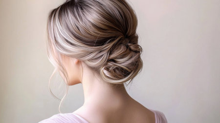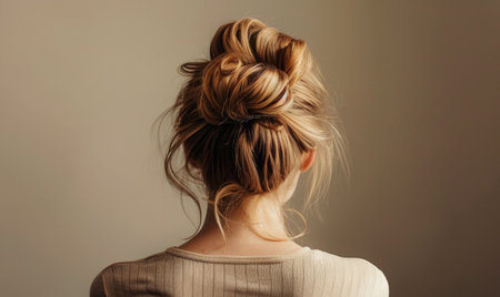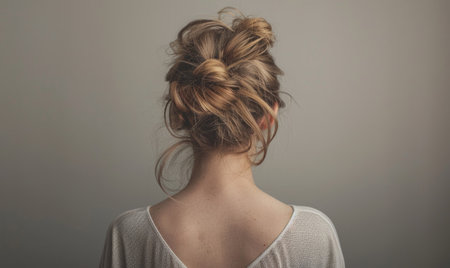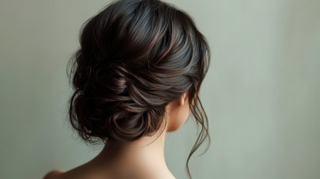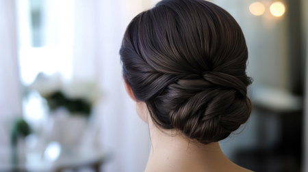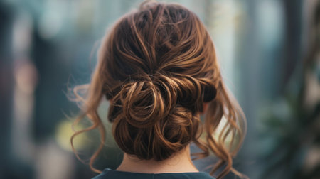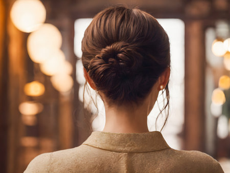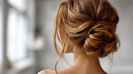 A captivating portrait of a woman seen from the back, featuring a beautifully styled hair bun with soft curls. The bright indoor setting enhances the elegance and charm of this hairstyle, perfect for beauty or fashion themes.