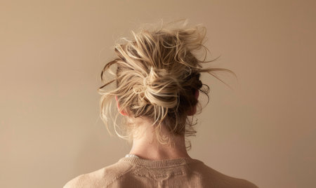A woman with sandy blonde hair, tied back into a messy bun, back view