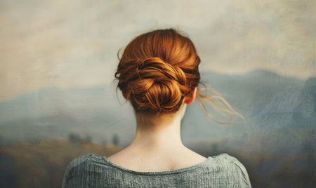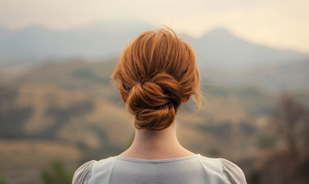 A redhead woman with her hair in a side bun with landscape on background, back view