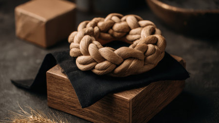 A beautifully woven natural fiber bracelet rests on a wooden surface, complemented by dark fabric. This composition showcases artistry and style in an aesthetic setting.