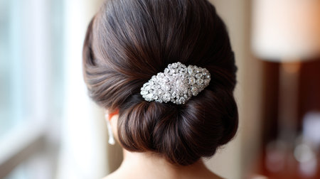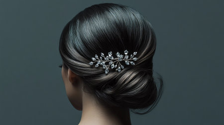 A stunning close-up of a sleek dark hair updo featuring an elegant hair accessory, perfect for formal events, bridal photography, or beauty styling inspiration.