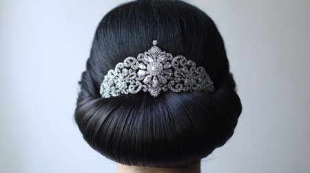 A stunning view of a woman's elegant updo hairstyle adorned with a sparkling hairpiece, perfect for weddings and special events, showcasing beauty and sophistication.