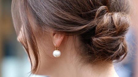 This close-up image showcases an elegant woman wearing a stylish hair updo complemented by a striking pearl earring. The soft natural light enhances the beauty and simplicity of the hairstyle, creating an inviting and serene atmosphere. Perfect for fashion and beauty themes.