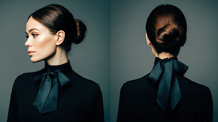 This captivating image showcases a woman with a sophisticated bun hairstyle adorned with a bow. The side and back views highlight elegance and refined beauty, making it perfect for fashion and beauty themes.