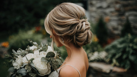 A serene bride showcases an elegant updo hairstyle while holding a stunning floral bouquet in an enchanting outdoor garden setting.