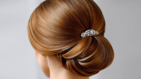 A beautiful and elegant hairstyle featuring a smooth updo adorned with a decorative hairpin, perfect for weddings and special events. The shine and texture highlight the artistry of modern hair design.