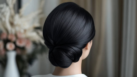 This image showcases an elegant black bun hairstyle viewed from behind. The soft lighting and indoor setting emphasize grace and sophistication in beauty and fashion.