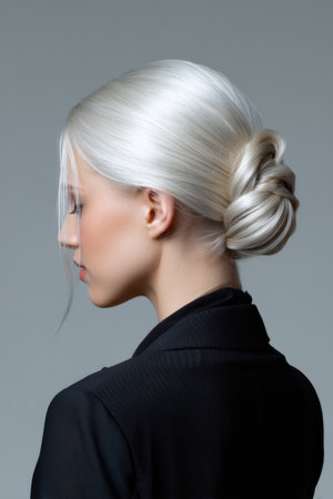 A woman with blonde hair is wearing a black jacket and has her hair in a bun. Concept of elegance and sophistication, as the woman's hair is styled in a neat bun and she is wearing a black jacket
