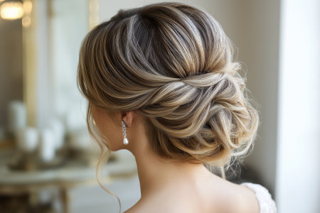 A stunning image capturing a woman's elegant hairstyle featuring a beautifully styled bun and delicate earrings, perfect for bridal inspiration.