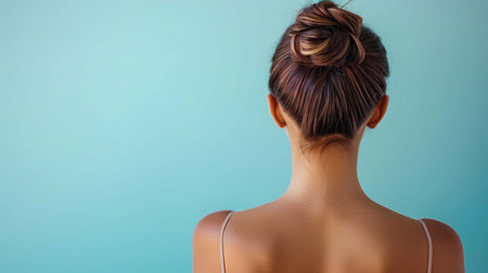 A woman with a bun hairstyle faces a light blue wall, embodying calmness and tranquility