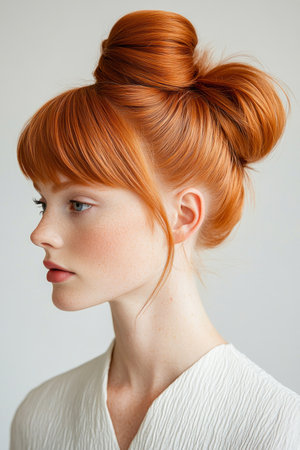 Profile of a fashion model with a trendy double bun hairstyle and ginger hair, showcasing a modern and stylish look