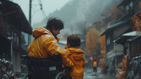 An elderly man in a wheelchair spending time with a child outdoors.