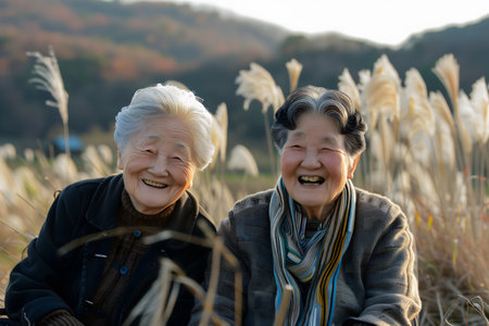 Two Korean joyful elderly ladies in a field at sunset
