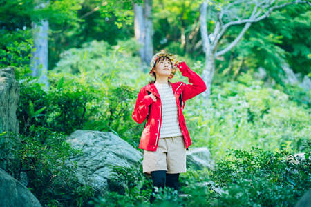 Group of asian family walking in the forest at sunny day.