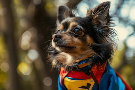 Adorable chihuahua dressed as a superhero with a cape, posing outdoors with a blurred background
