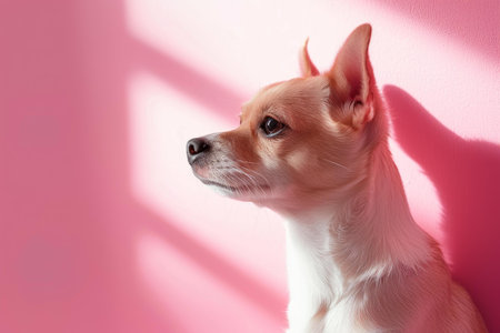 Contemplative chihuahua enjoys the warm glow of a pinkhued light, displaying a peaceful demeanor