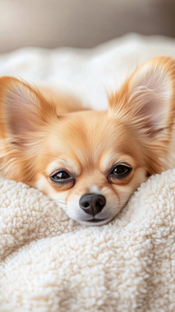 A small chihuahua rests peacefully on a fluffy blanket, eyes closed, in a serene living room adorned with soft, glowing lights. The atmosphere is warm and inviting.