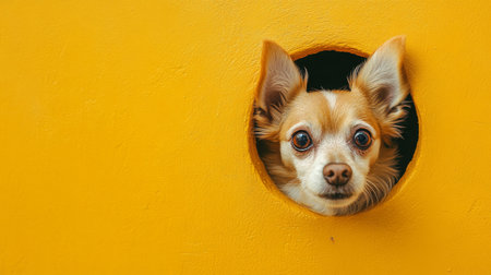 Small dog peeking through yellow wall, curious expression. Pet and curiosity concept