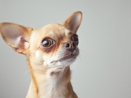 Close-up portrait of a small Chihuahua dog with short tan fur and large eyes, looking upward. Captured in a minimal studio setting with soft lighting, creating a playful atmosphere.