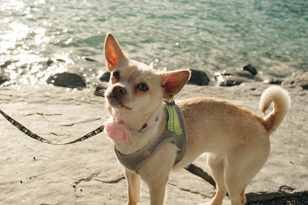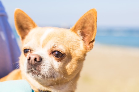 Chihuahua dog is on summer vacation at seaside resort and relaxing rest on summer beach of Hawaii