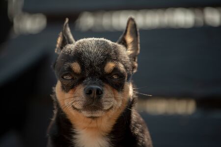 Pet, animal. Chihuahua dog tricolor portrait close-up on sunset background.