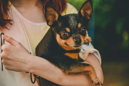 Girl and dog. Girl holding chihuahua. Girl with her pet in her arms. Children love their animals.Chihuahua dog in the arms of a girl. portrait male chihuahua dog in the arms of a caucasian teenage gir
