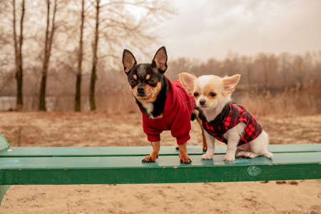 Two little chihuahua dogs on bench. Cute domestic pets outdoors. Chihuahua dogs on bench in clothes.