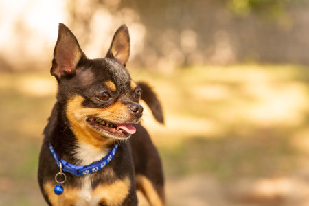 Animal, pet .Purebred dog tricolor chihuahua in nature in a blue collar.