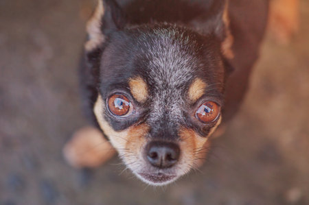 An adult dog looks into the frame. Dog breed chihuahua tricolor portrait. Animal, pet.