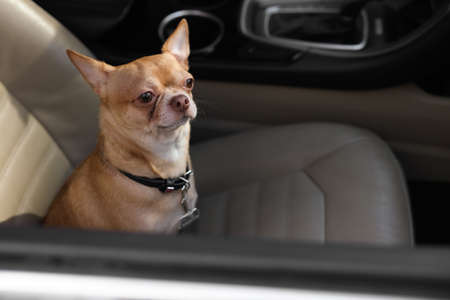 Cute Chihuahua dog on dark sofa in cozy home living room. Portrait doggy Chihuahua. Concept pet love and family friend