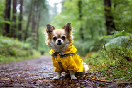 Charming chihuahua in yellow raincoat on forest path during rainy weather, looking at camera