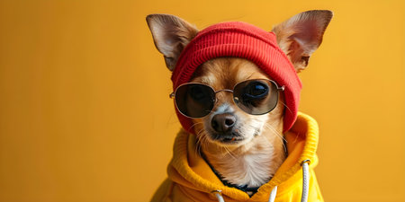 Chihuahua dog dressed as a rapper wearing hip hopinspired clothes in a playful fashion scene. Concept Pet Fashion, Hip Hop Style, Playful Costumes, Fun Photoshoot